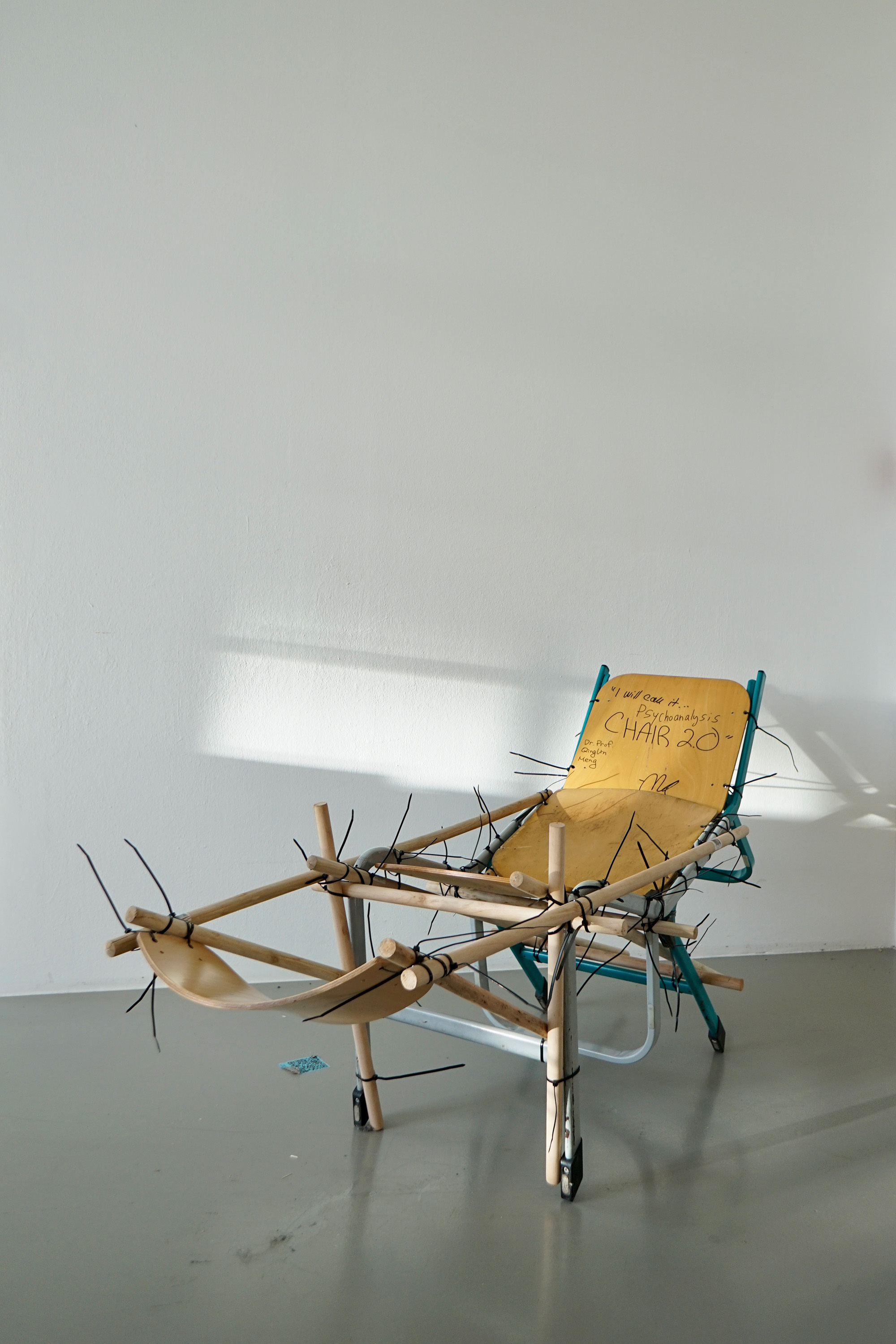 school chair, broomsticks, cable ties and wood / 120 x 50 x 90 cm / 47.2 x 19.7 x 35.4 in