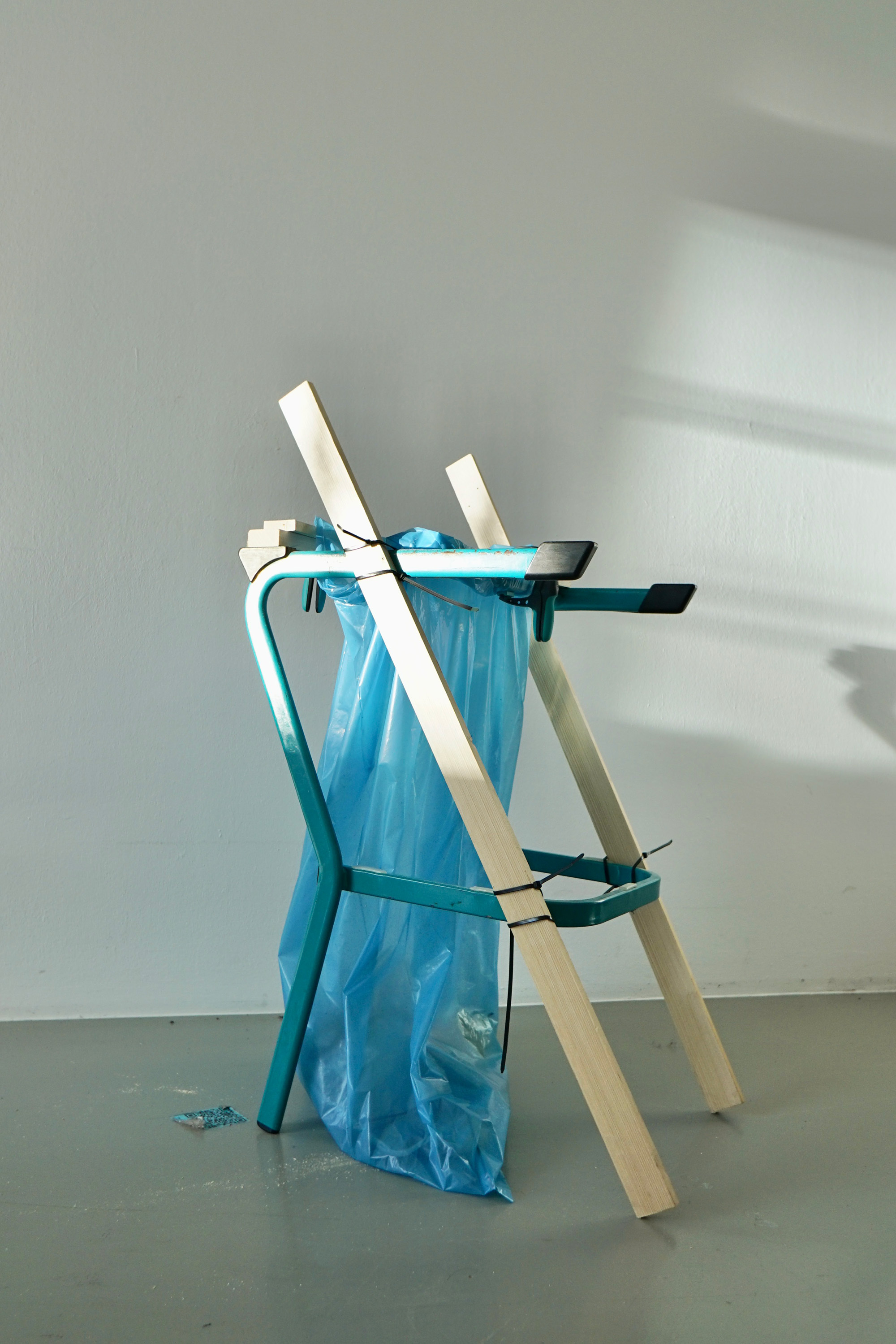 school chair, broomsticks, cable ties and wood / 120 x 50 x 90 cm / 47.2 x 19.7 x 35.4 in